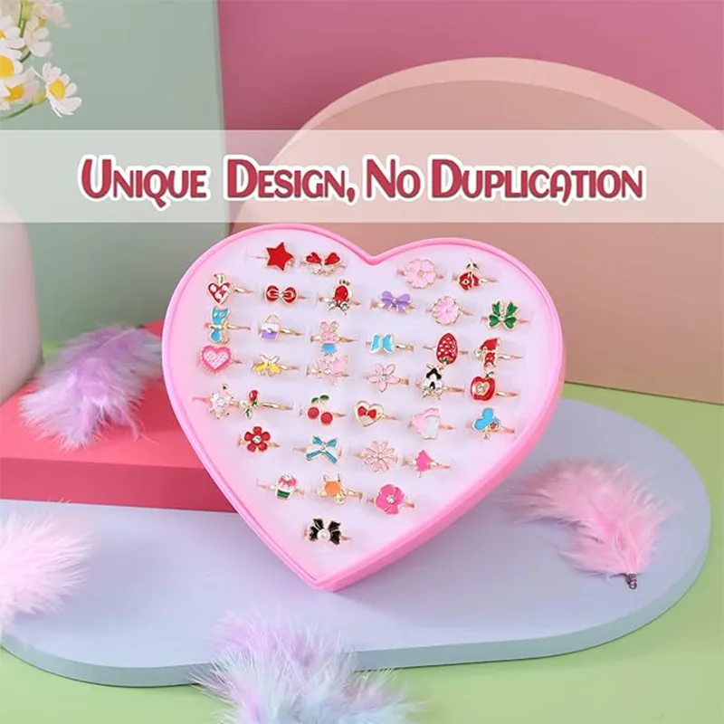 বাক্সের ভিতরে 36টি সুন্দর মেয়ের মিশ্র গহনার আংটি রয়েছে। এই সমস্ত রিংগুলি রঙিন এবং চতুর, সাদা খরগোশ, স্ট্রবেরি, ফুল, পেঁচা, তারা, কচ্ছপ, বিড়ালছানা, ধনুক, আপেল, চেরি, প্রজাপতি, মাশরুম, ইউনিকর্ন, ক্লোভার ইত্যাদির মতো প্যাটার্নগুলি বৈশিষ্ট্যযুক্ত৷ এটি আপনার প্রিয় রাজকুমারীর জন্য একটি দুর্দান্ত উপহার৷